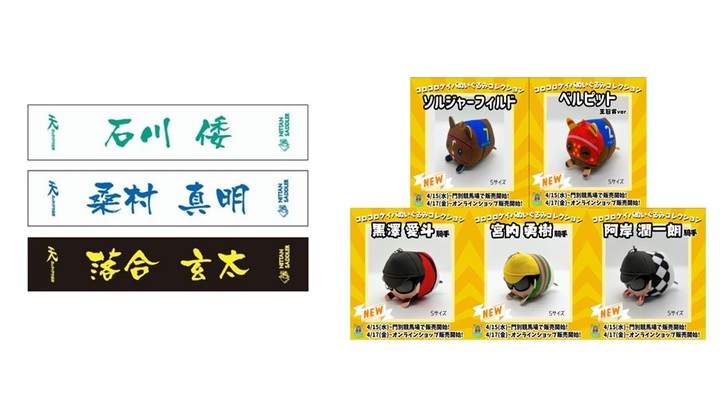 日胆サドラー様で好評発売中のジョッキーマフラータオルと、コロコロケイバ様より各種ぬいぐるみを門別競馬場で先行販売致します。
