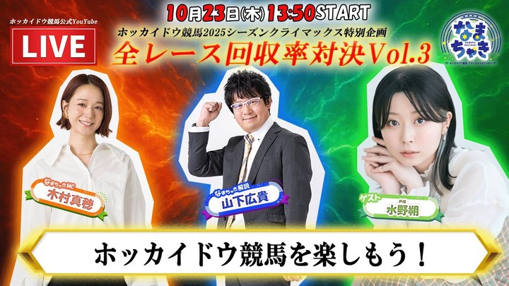 YouTube【公式】 ホッカイドウ競馬チャンネル「なまちゃきLIVE」のゲスト紹介(10月23日)今回は、10月23日の「なまちゃきLIVE」の出演者を発表します。 10月23日のメインレースはモーリス・プレミア