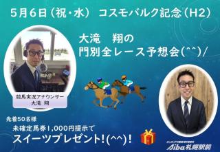 Aiba札幌駅前イベントについて(5月6日) イベント 2026.04.28 Aiba札幌駅前では、5月6日(水祝)に競馬実況アナウンサー大滝翔さんによる門別競馬場予想会を行います。 また、先着50名様に1,000円以上の未確定馬券を提示でスイーツをプレゼントいたしますので、皆さまぜひお越しください。